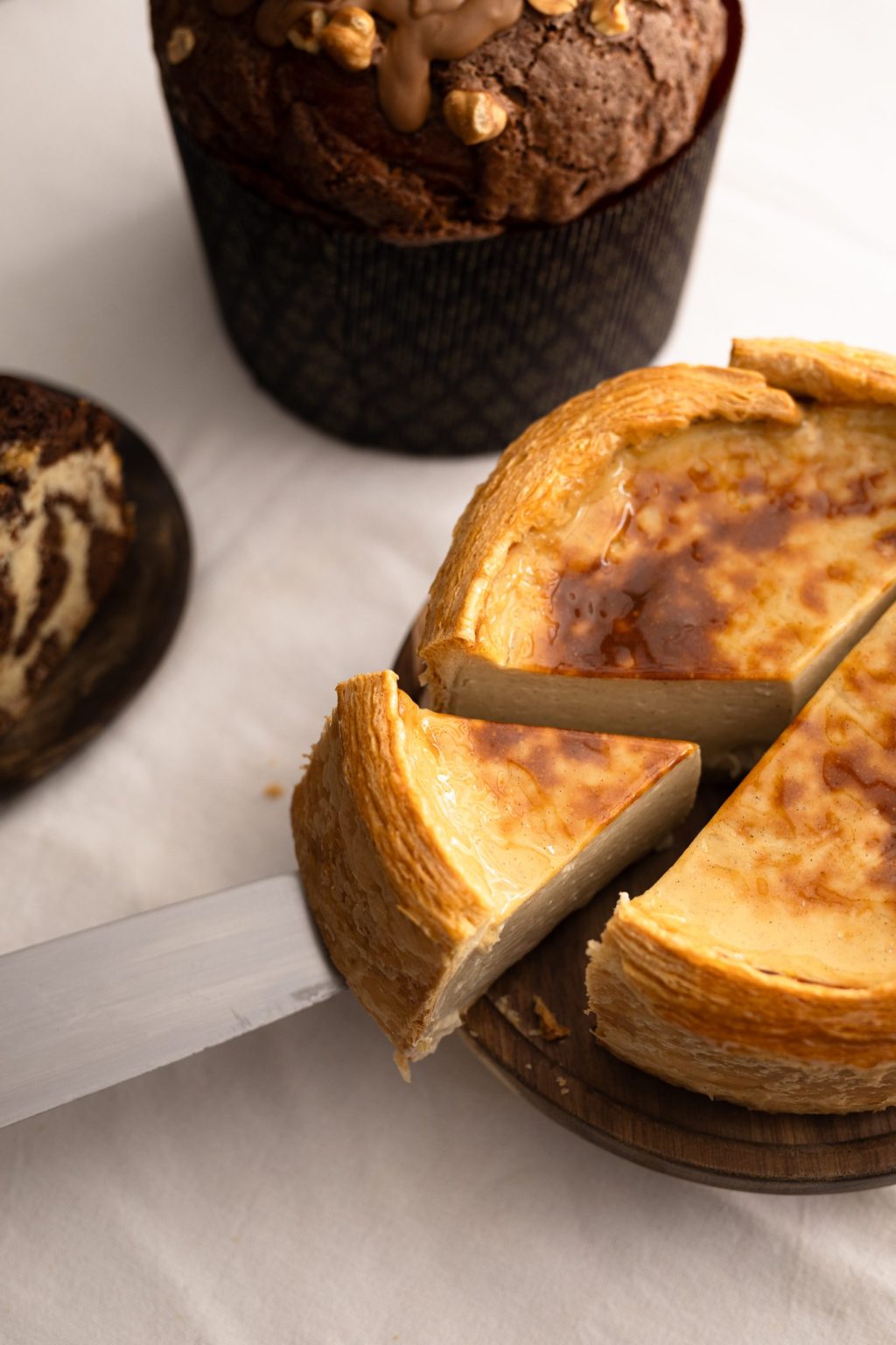 recette du flan parisien en deux versions : vanille de Madagascar et praliné noisette, disponibles entiers ou à la part.